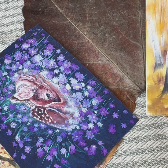 A cozy mini art print set from the Autumn Rustle collection — featuring warm forest and meadow scenes: fox among berries, golden birch trees, woodland mushroom, girl with the wolf, and resting fawn among violets.