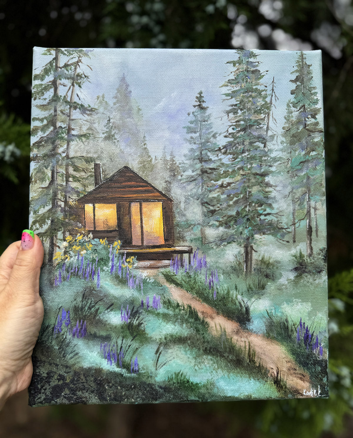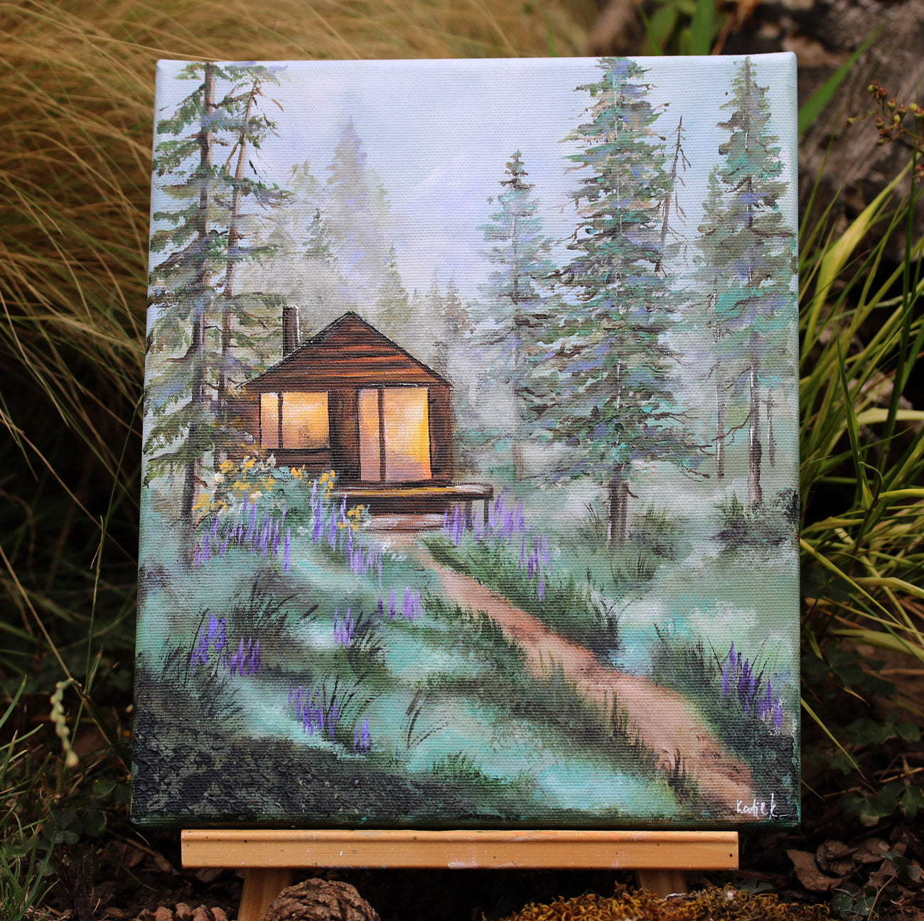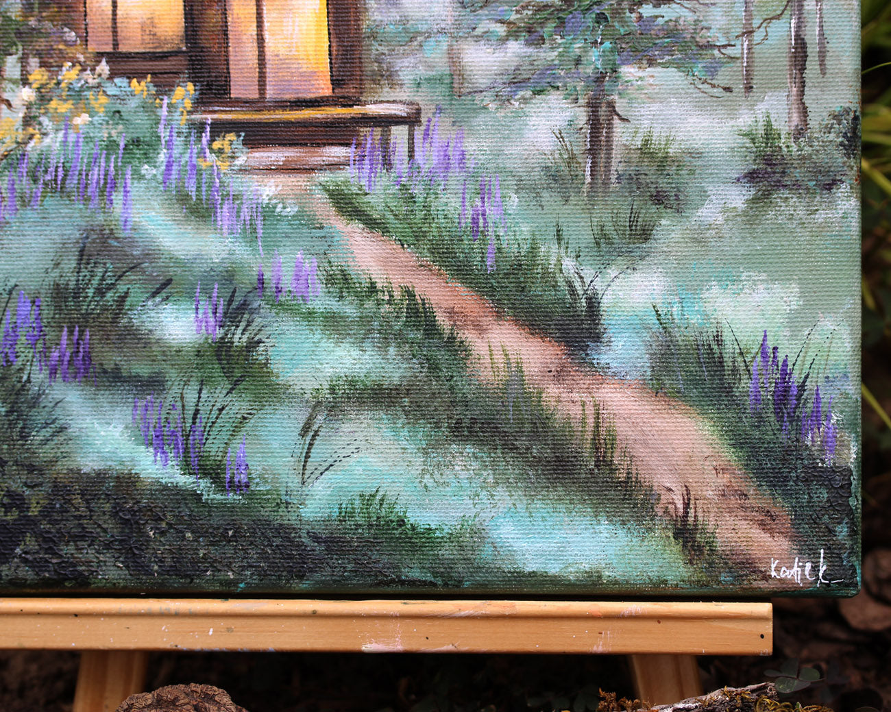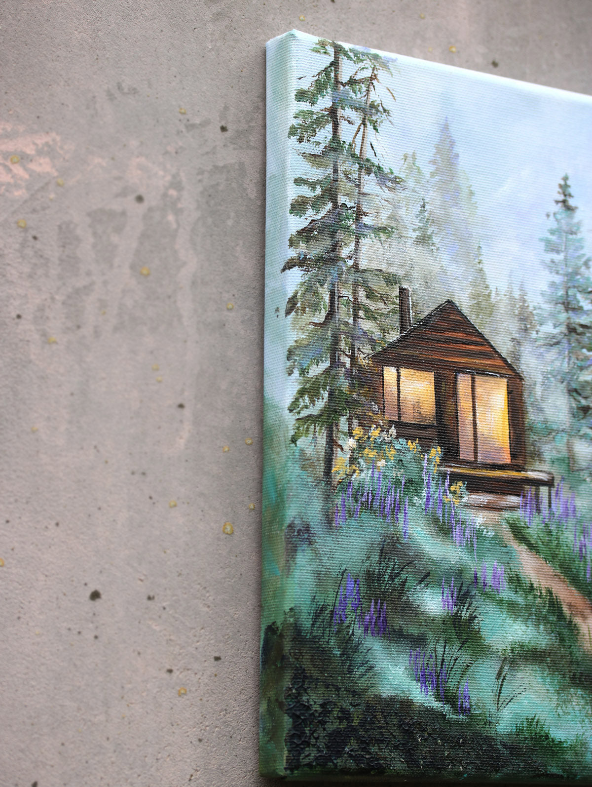 This peaceful forest painting features a quiet cabin nestled among pine trees and blooming lupines. Soft morning light and gentle mist invite you to step away from city noise and reconnect with the natural world.