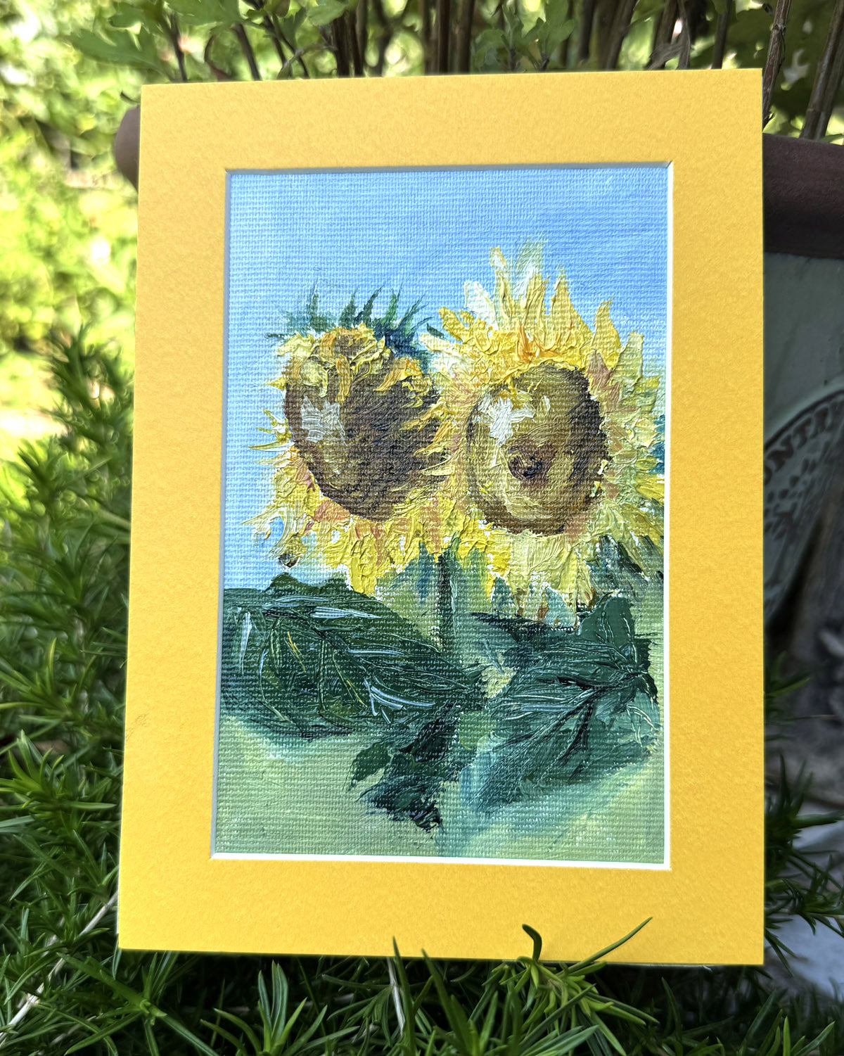 Two sunflower blooms leaning toward each other under the summer sun - bring their warmth home today.