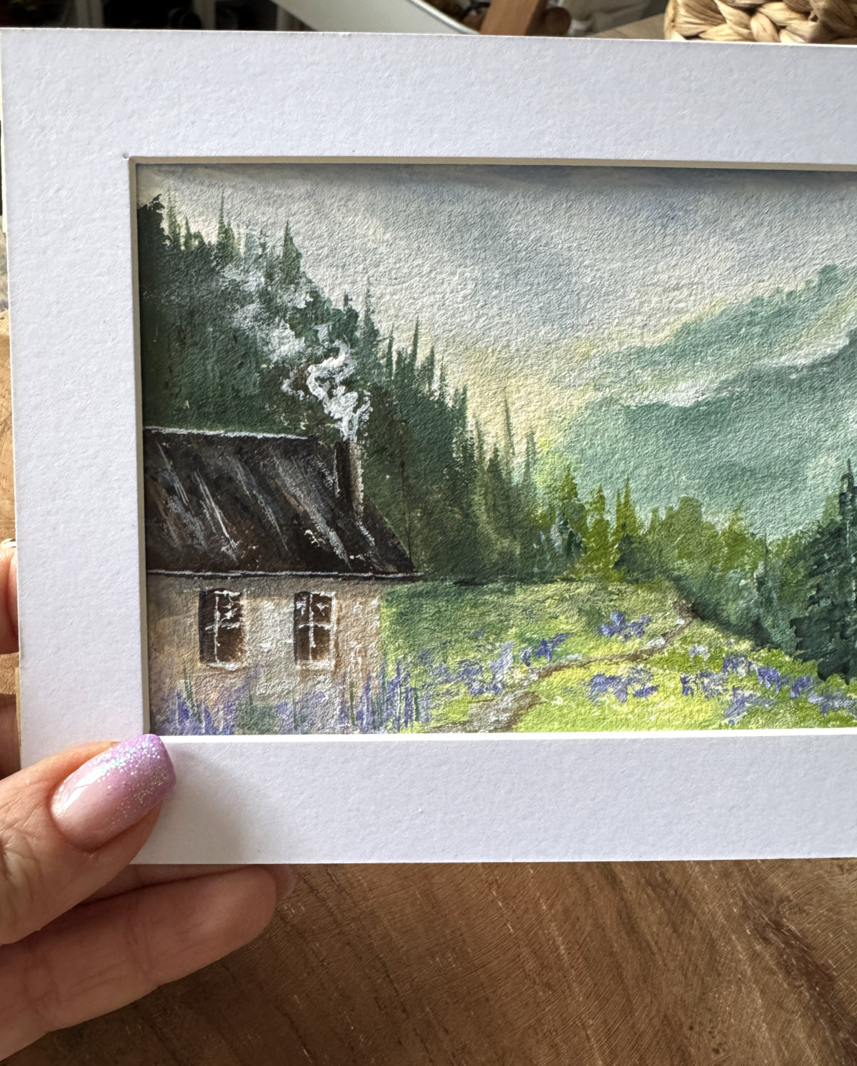 This hand-painted miniature captures a peaceful forest morning with soft sunlight rolling over green hills and a cozy cottage with smoke rising from its chimney. Tiny purple wildflowers scatter across the meadow, bringing a touch of warmth and life to the scene.