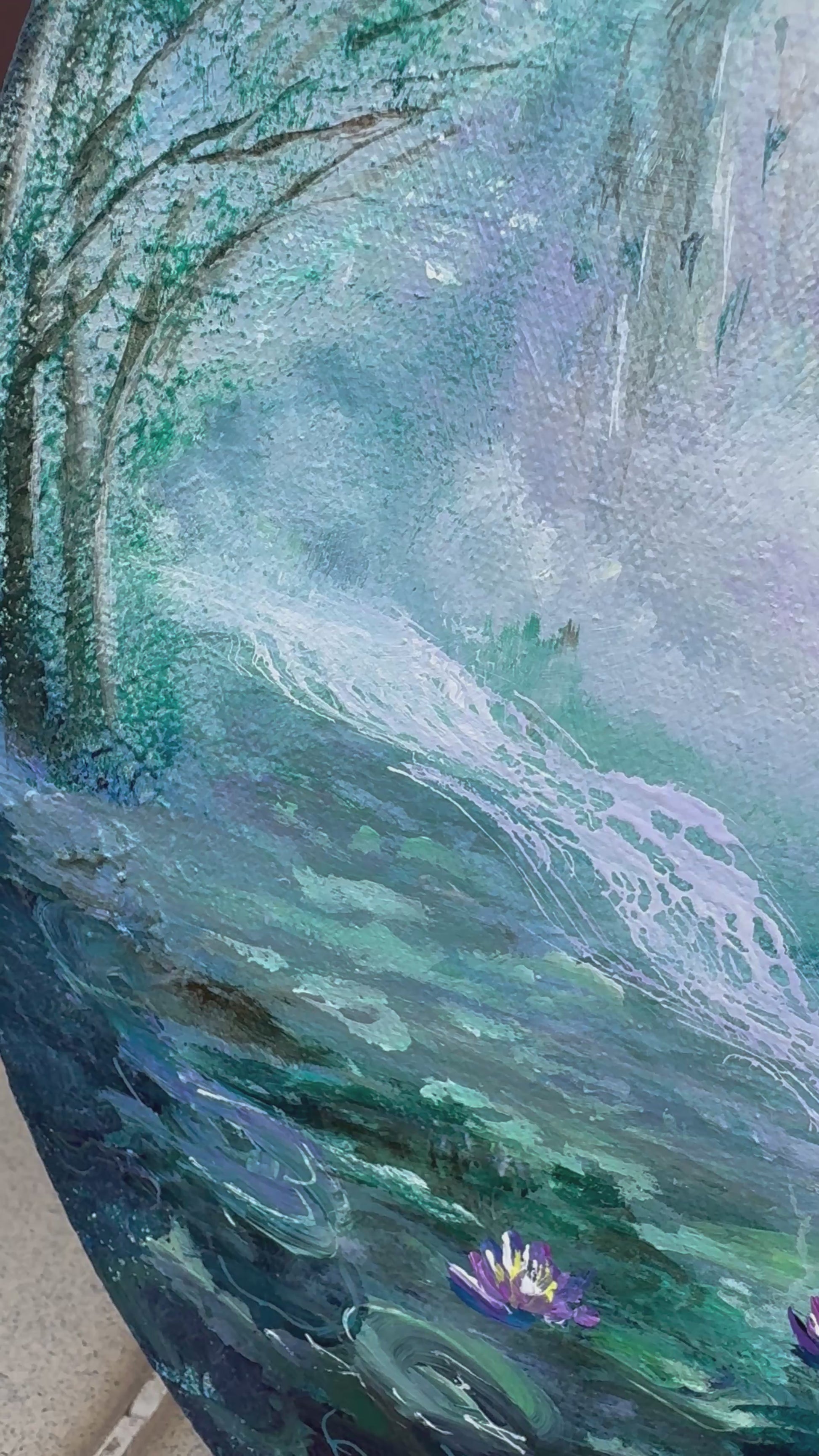 While I was painting bright summer lilies for new collection (the kind even Monet couldn’t resist), I kept circling this one round canvas with a leafy green underpaint. And suddenly a White Lady appeared at the water’s edge, looking toward a distant castle.