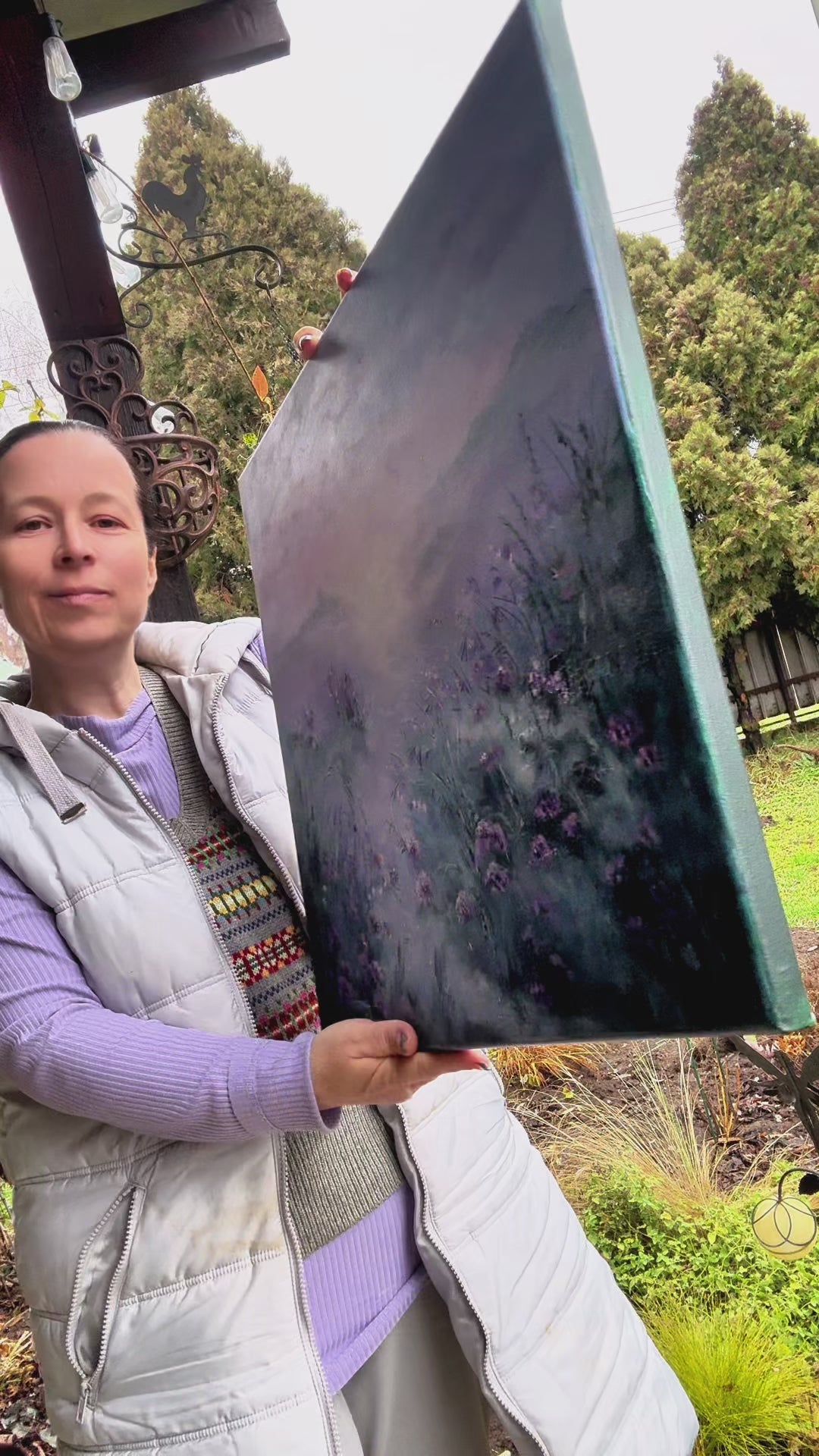 This piece opens up like a quiet landscape — layers of mist, gentle hills, and scattered wildflowers coming forward through the haze. The larger square format gives the scene room to breathe, making it a calm focal point for a living room, bedroom, or reading corner.