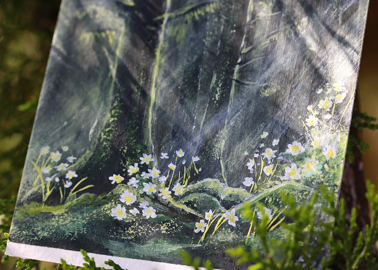 Enchanting forest scene with wild white delicate flowers and sun rays.