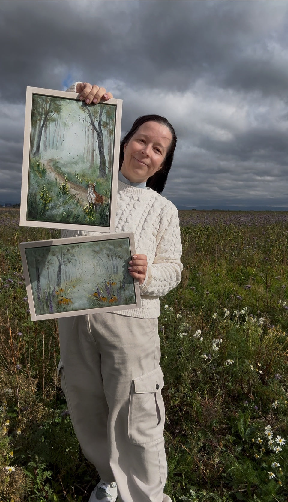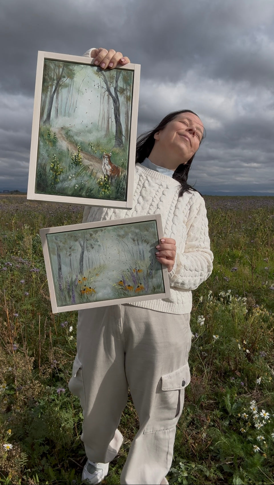 Hand-painted artwork of a misty autumn forest with a curious fox. Inspired by our early walks through the woods, it captures that fleeting moment when everything feels still - and the forest belongs only to its wild inhabitants.