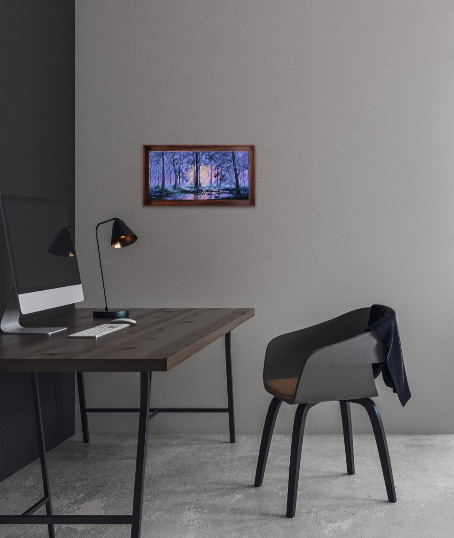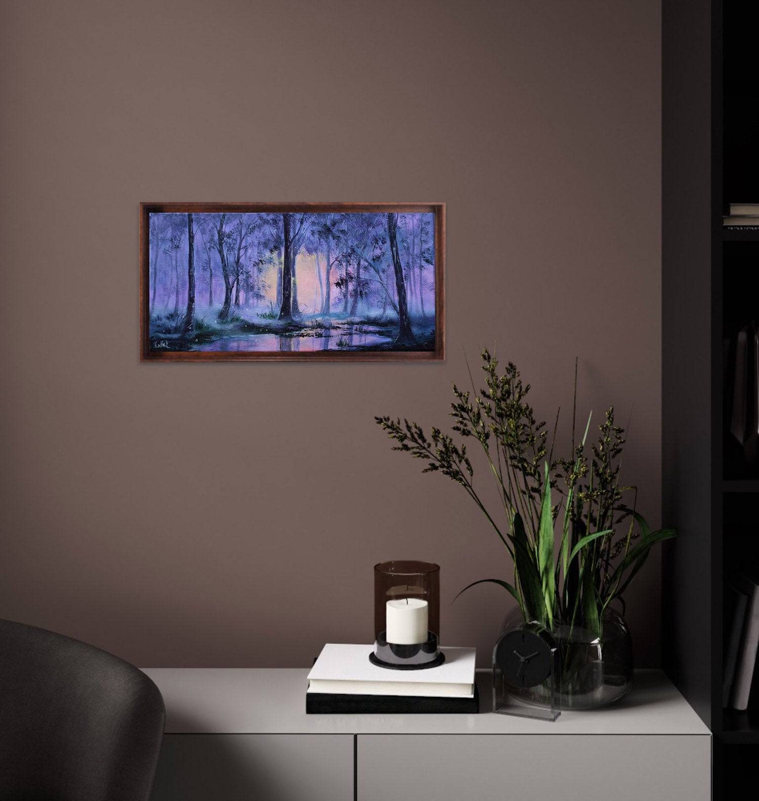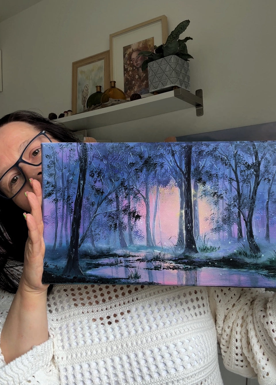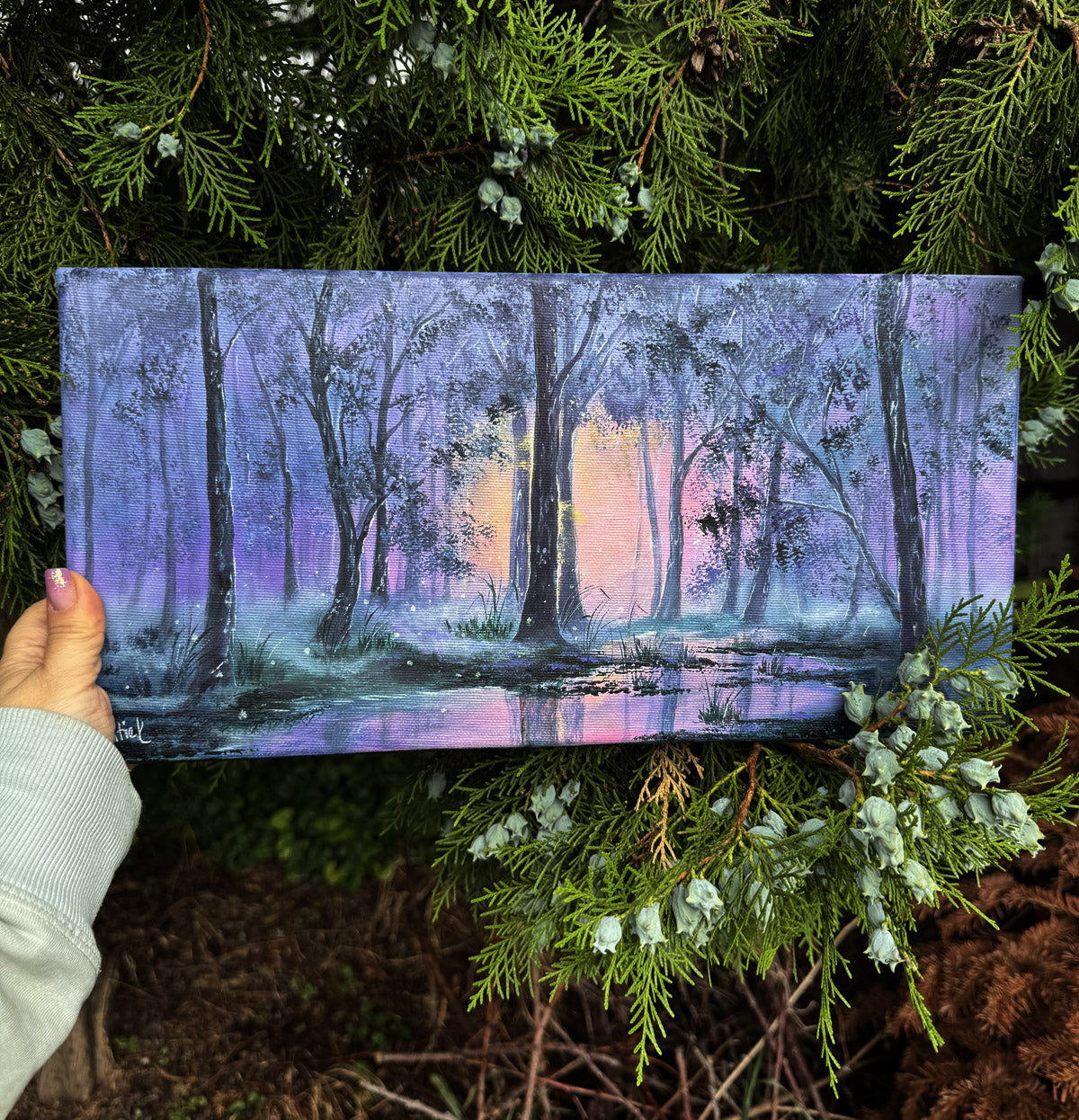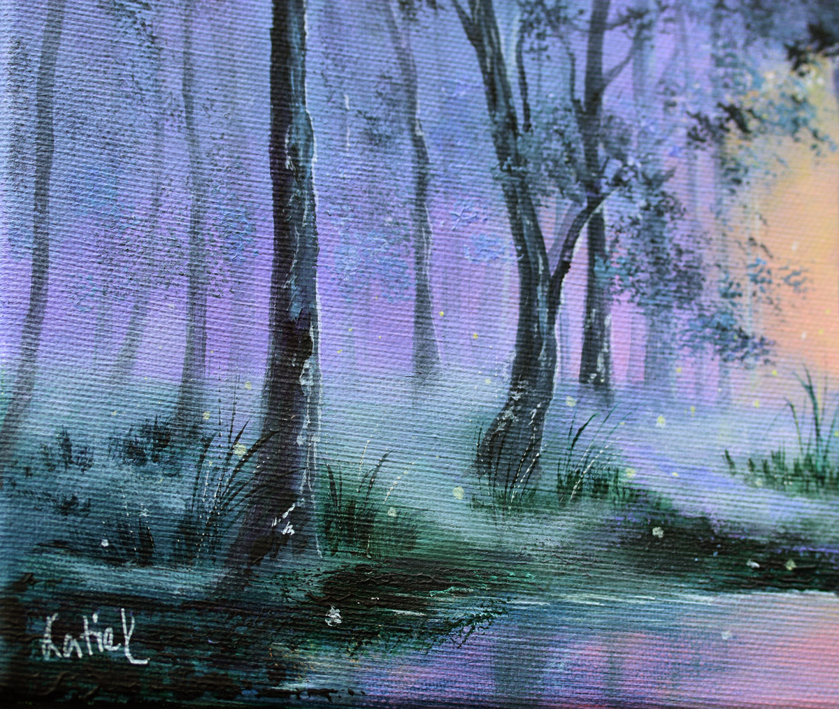 Step into the calm of a magical twilight forest. “Luminlake” is a dreamy acrylic landscape with oil accents and glowing reflections and misty woods. Perfect wall art for nature lovers and peaceful interiors.