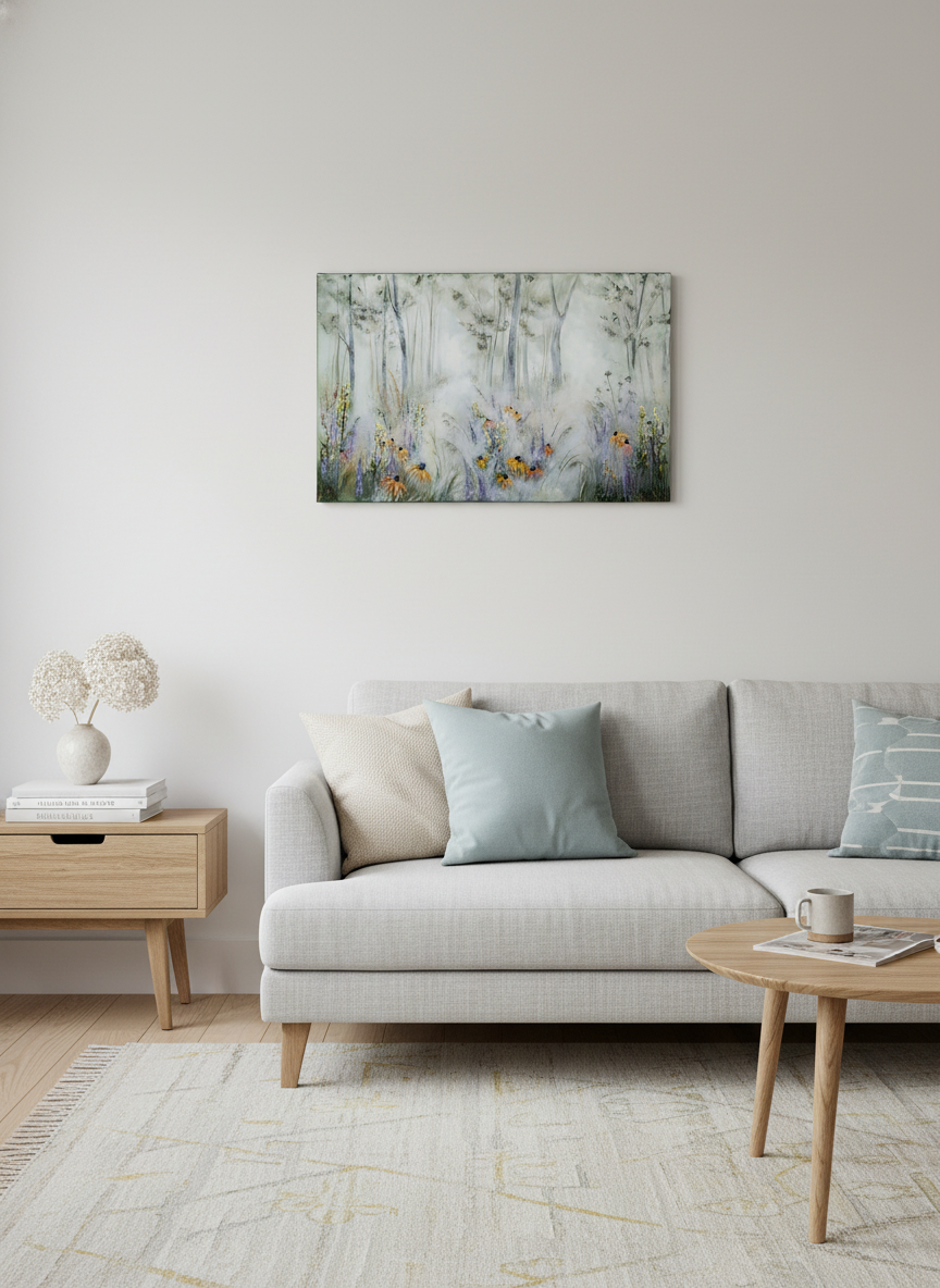 Hand-painted artwork of a misty autumn forest meadow, where wildflowers bloom in soft light and the air carries that quiet stillness only early mornings know.