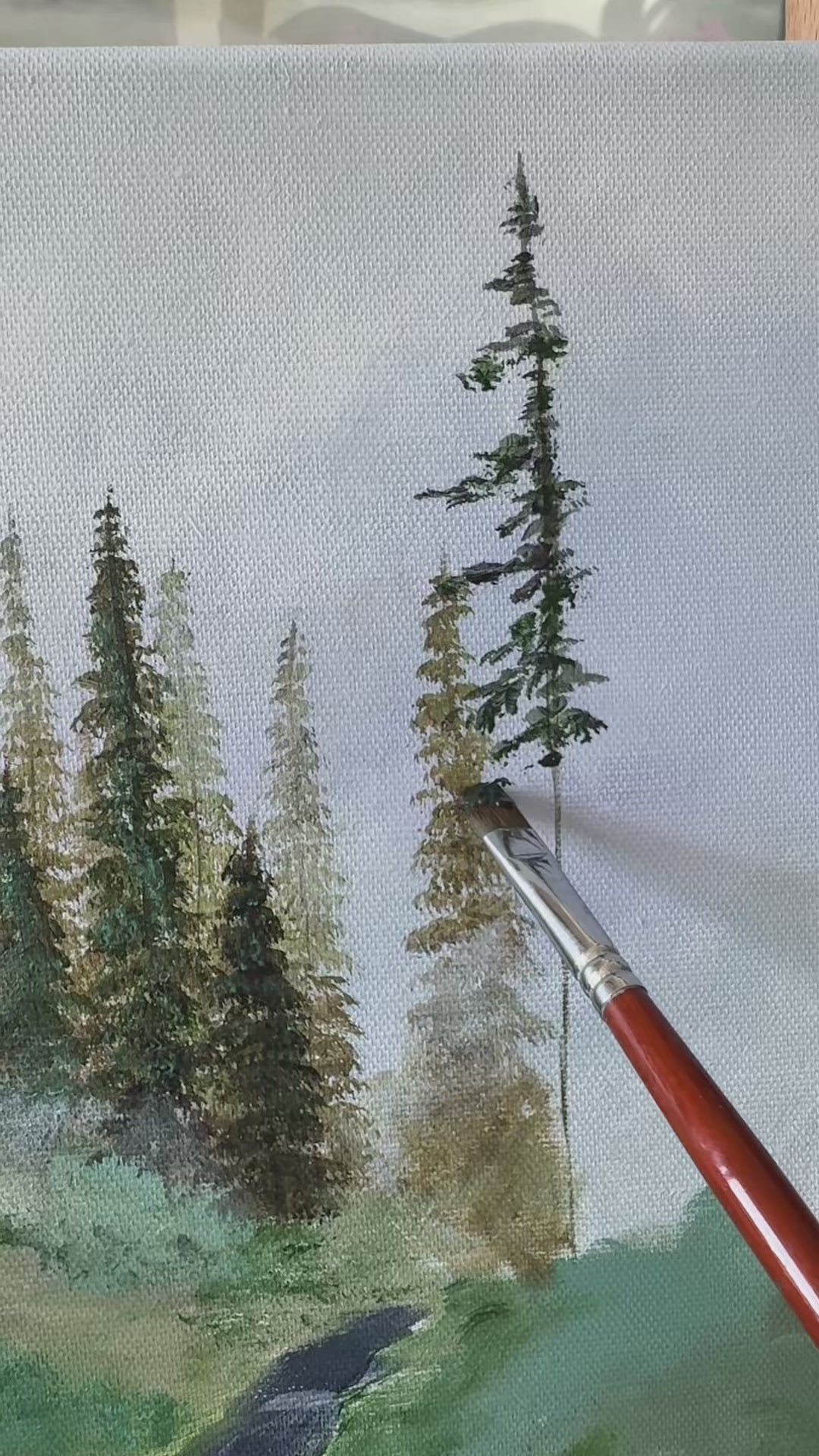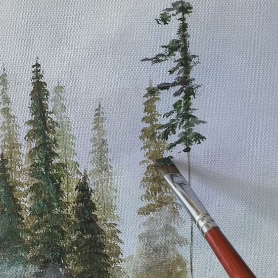 Hand-painted artwork of a misty morning stream flowing through a pine forest with blooming wildflowers - peaceful, detailed, and one of a kind.