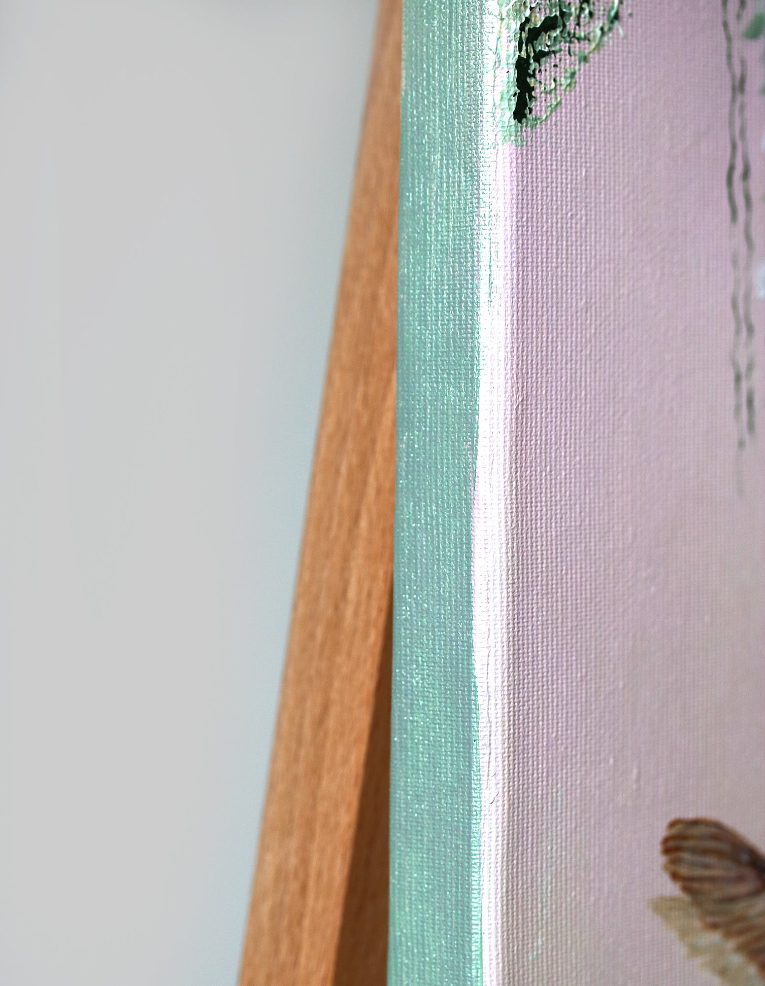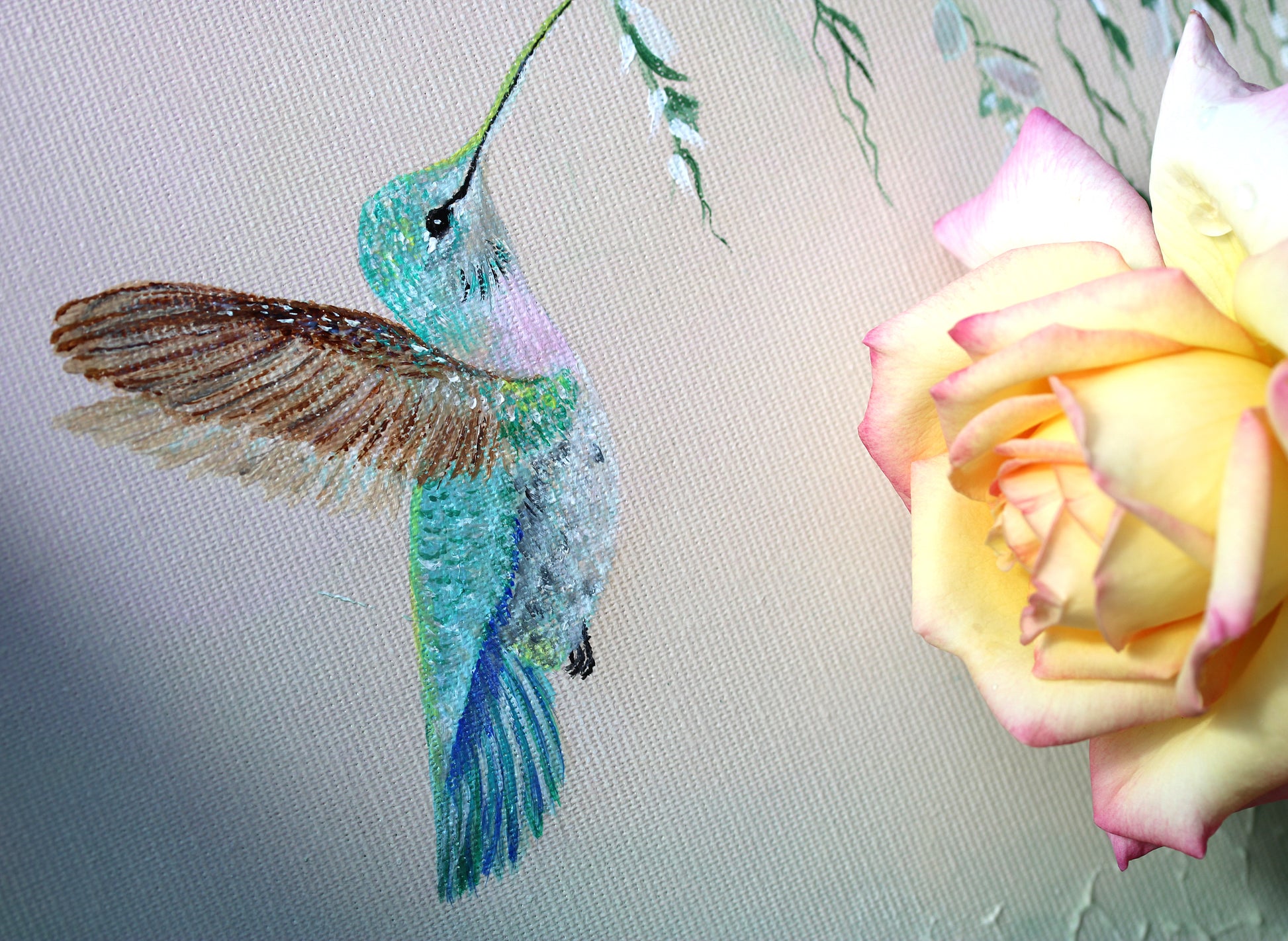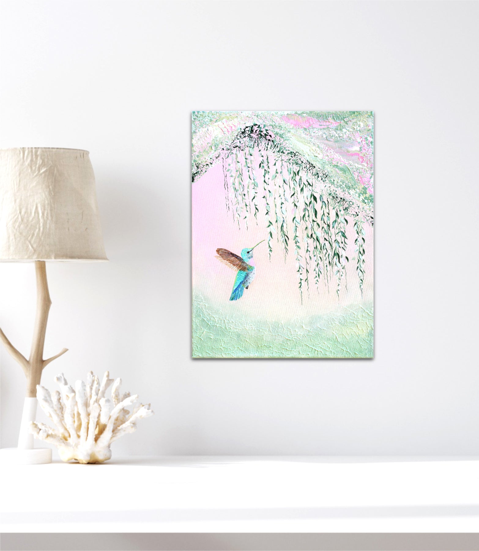 Tender green and pink with sparkling details in this acrylic painting. Main character is lovely hummingbird - I put pearly sparkling paint on her wings and feathers.