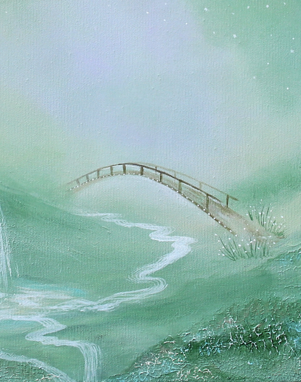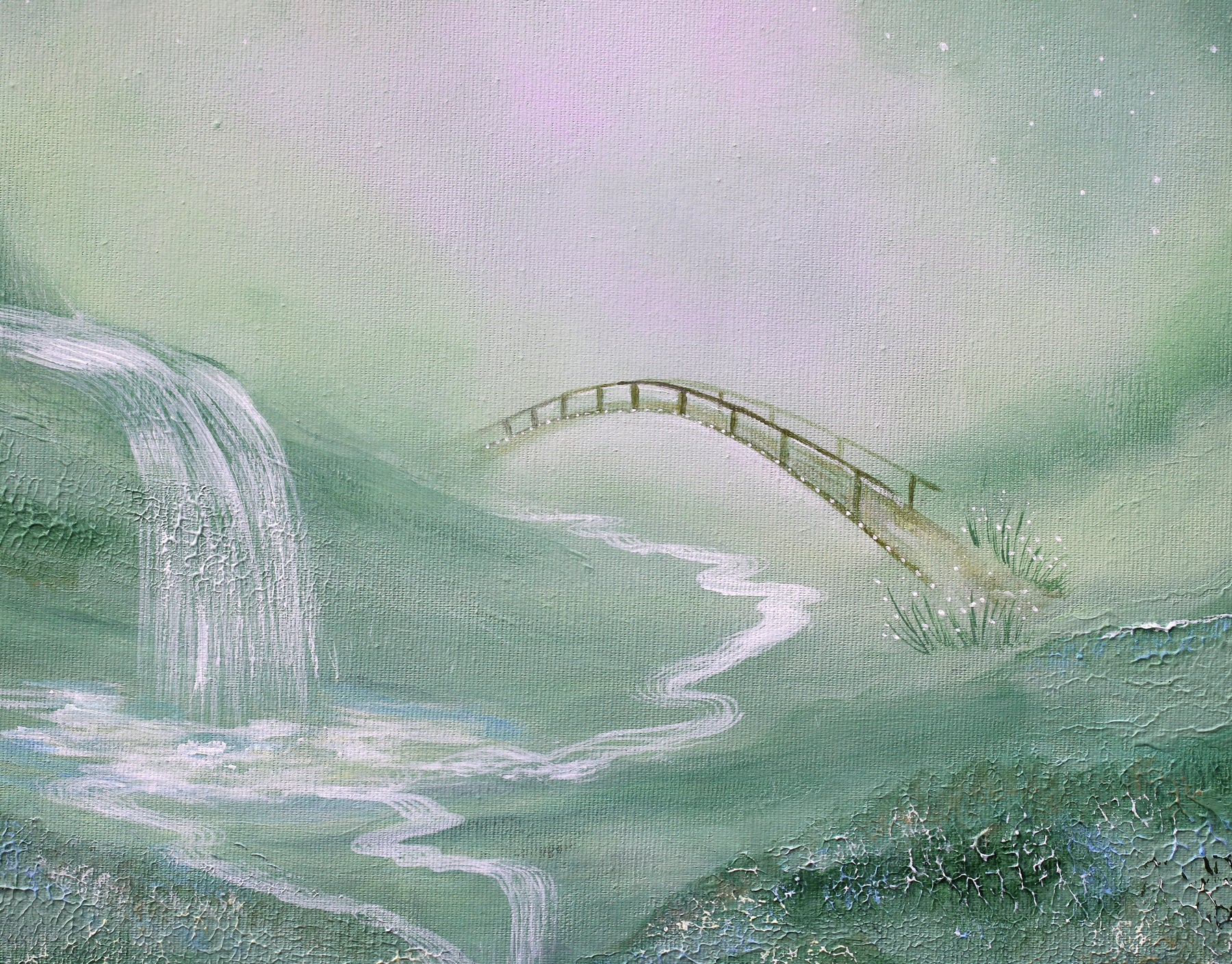 The painting captures the delicate, almost mystical feeling of the scene with flowing water and light intertwined like a soft, ethereal curtain.