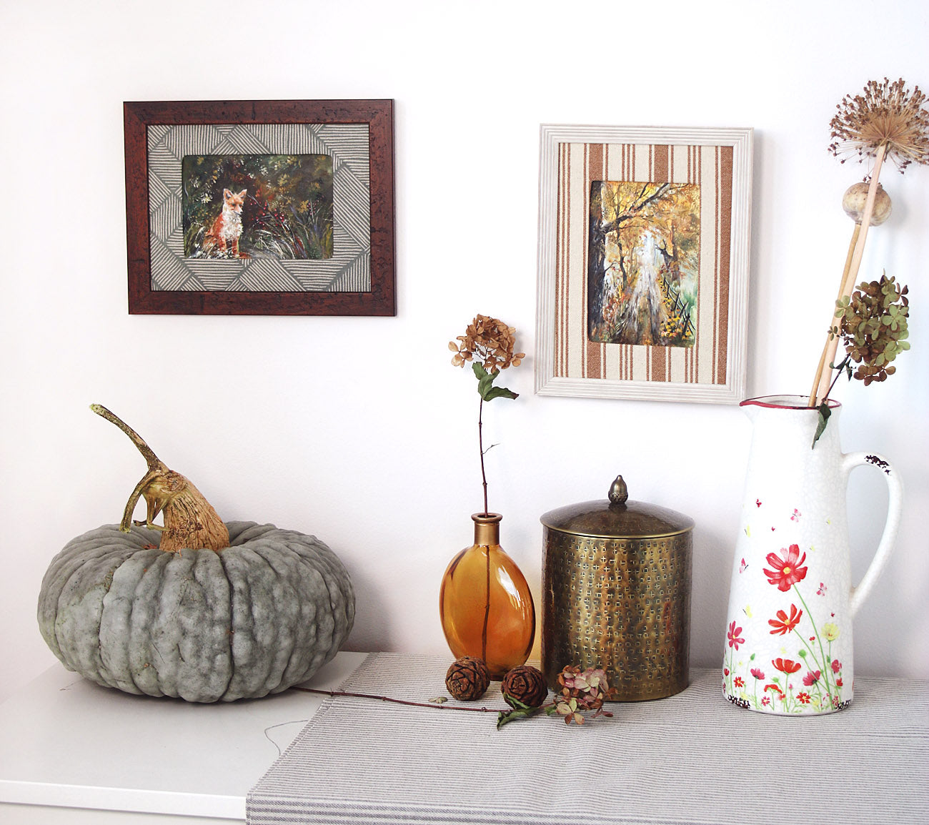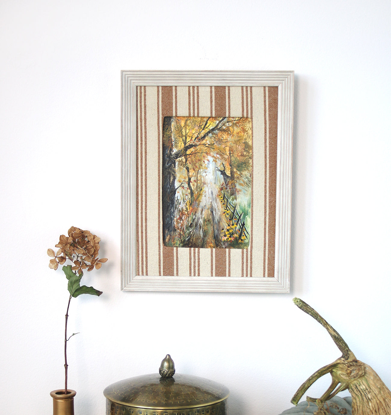 This is an original piece from my special series with handmade fabric mats. The striped textile, warm and autumnal, pairs beautifully with the wooden frame, giving the artwork a soft, inviting character - like a little window into a quiet forest.