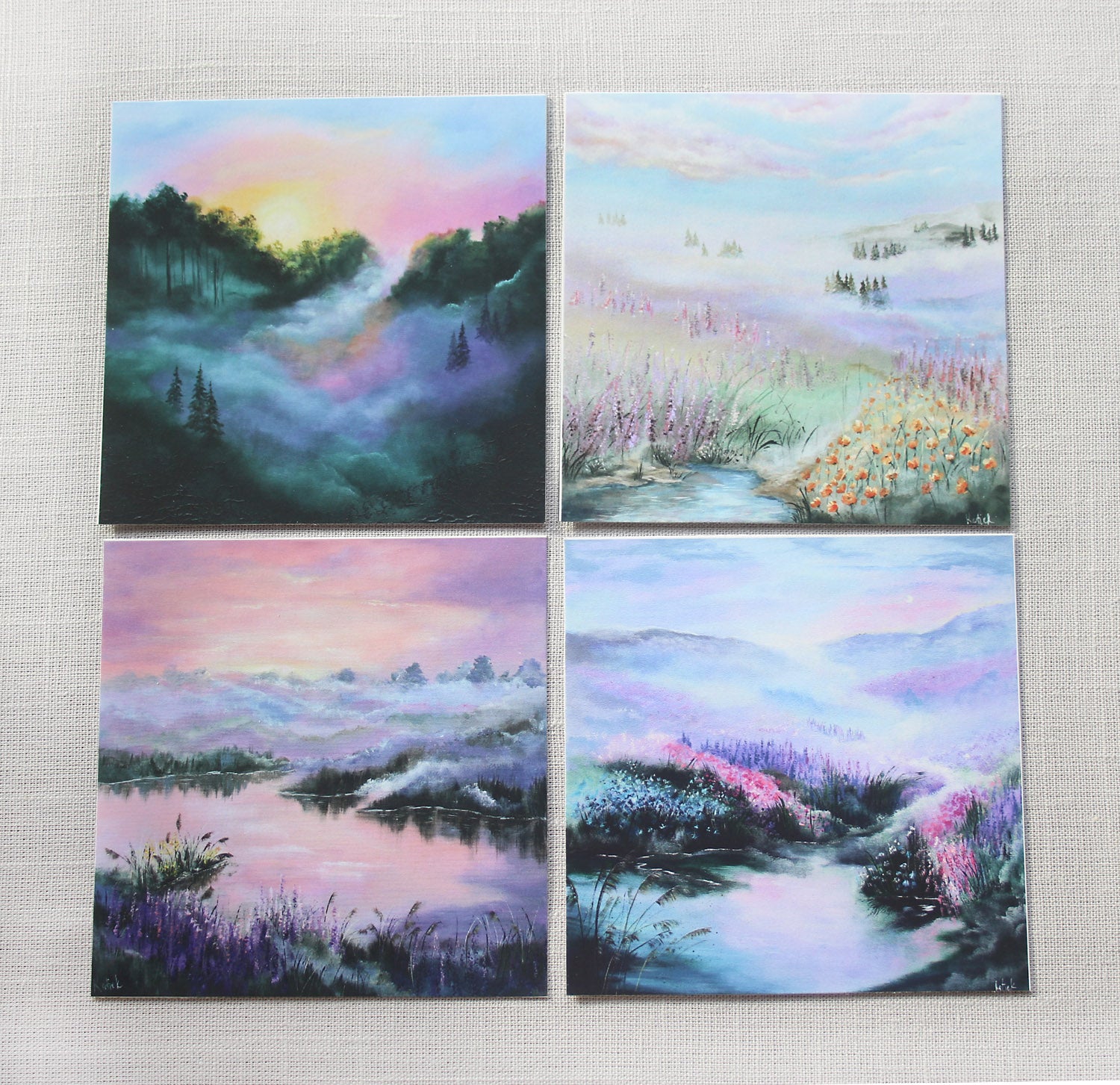 Each card is professionally printed on archival matte paper with pigment inks, preserving the soft light, subtle textures, and natural color transitions of the original artworks.